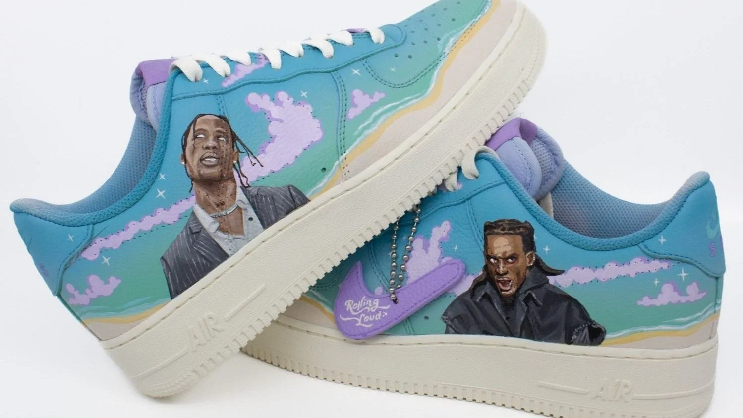 With the largest Hip-Hop festival on the horizon, I teamed up with Rolling Loud Portugal to host a giveaway via Instagram, giving followers the chance to win this custom pair. The giveaway reel was filmed and edited by me, documenting the design process. The pair is inspired by the festival’s ombre blue and green poster with purple fluffy clouds and this years headliners Playboi Carti and Travis Scott along with a custom hangtag made from the removed swooshes.