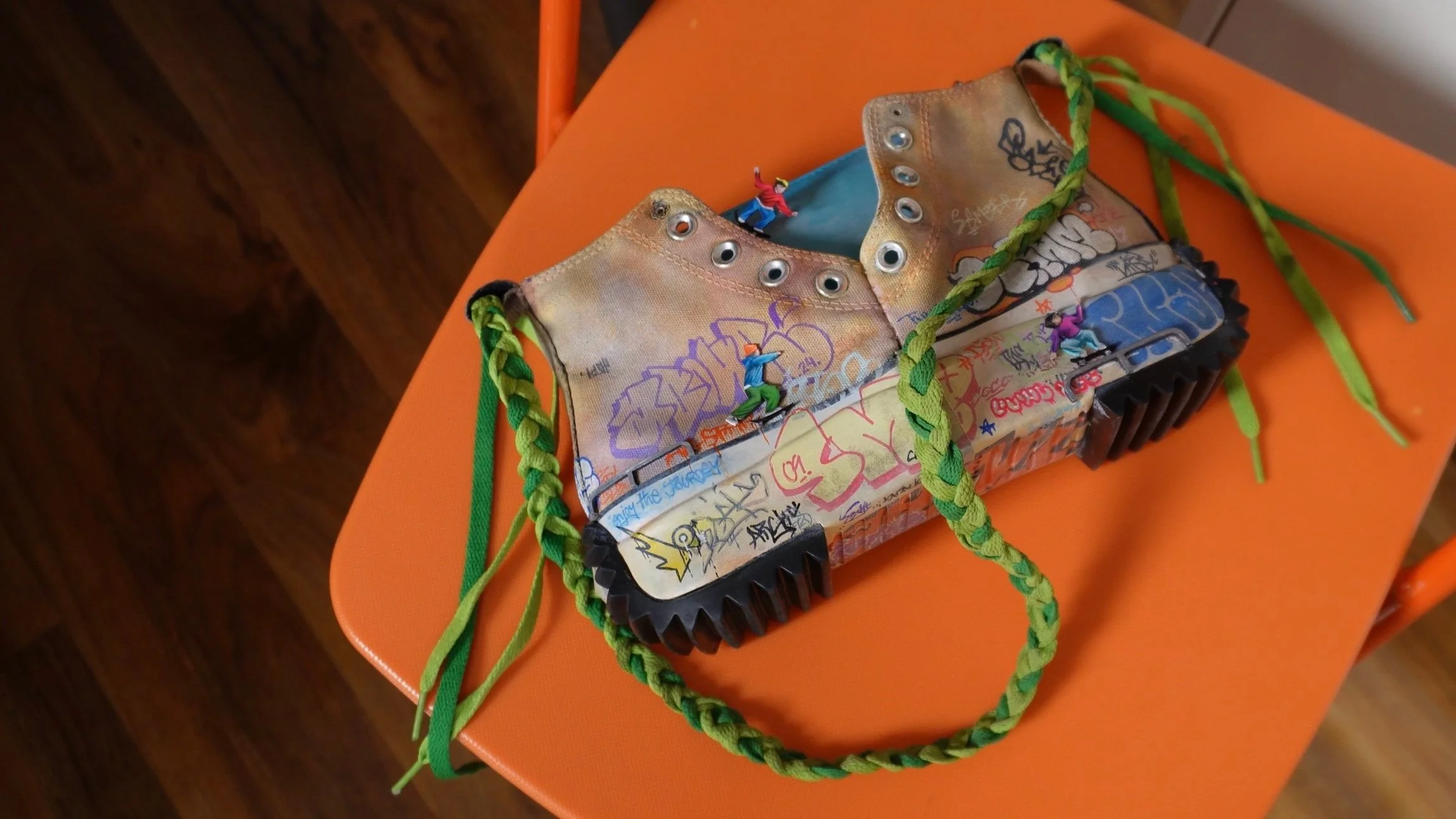 I collaborated with Thatsnotabag, a brand known for creating statement bags out of Converse sneakers, to create a skatepark themed piece. The process was documented on my Instagram and TikTok where I connected with my followers who directed the process of the piece. I loved the outcome of this one! I used painted leather offcuts to create mini me skaters and added as many follower suggestions and tags as I could. The bag comes with multiple strap options and a two-colour inner bag that can be swapped to match your outfit.