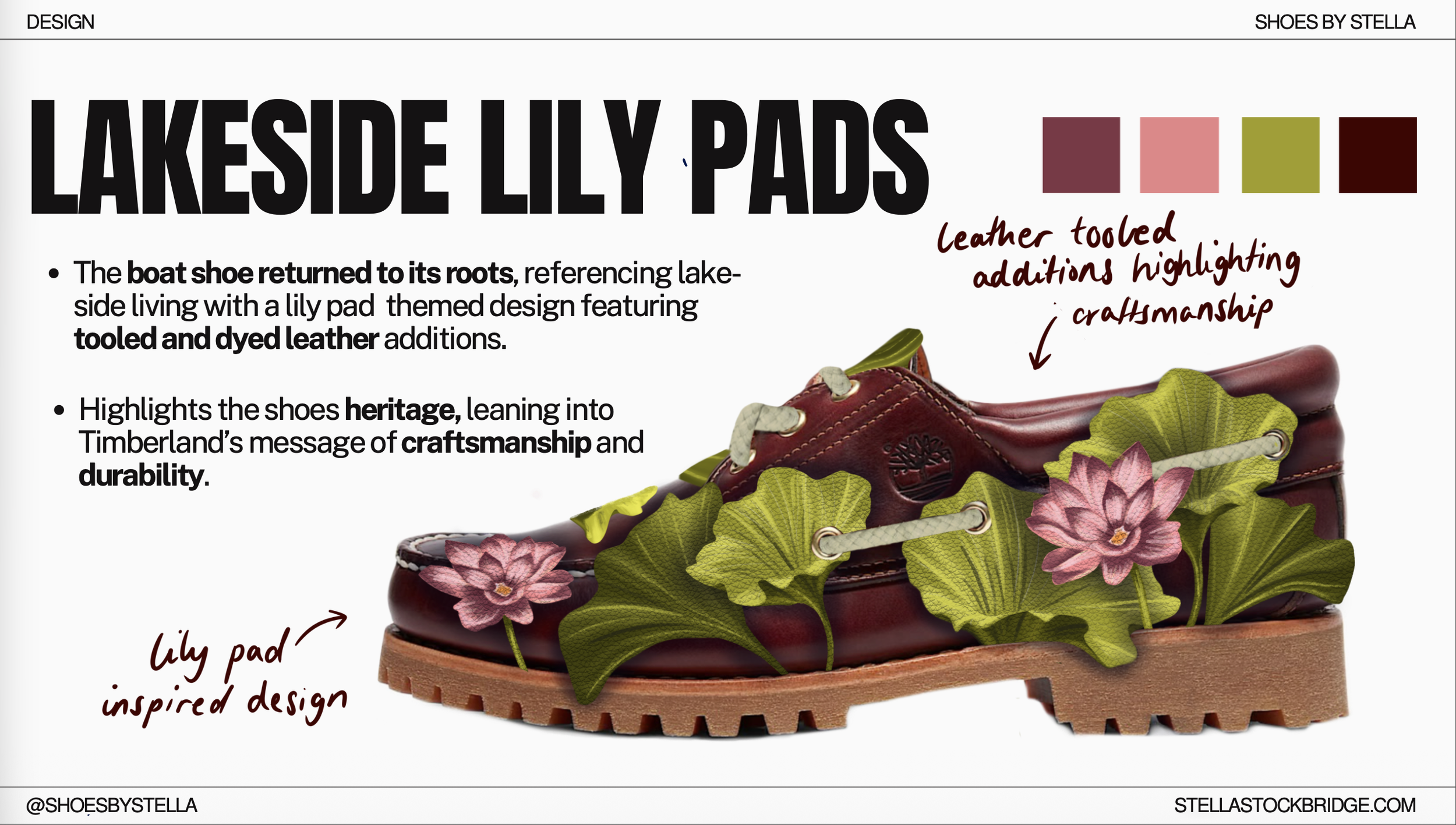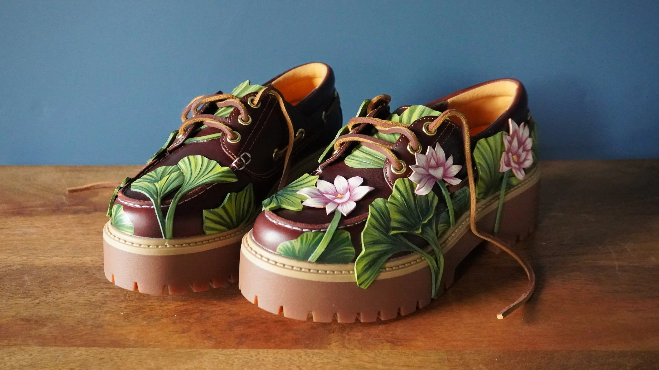 For this collaboration, I tapped into the Timberland Boat Shoe’s roots to create a lilypad-themed pair perfect for spring. Each leather addition was hand-tooled and painted to create a three-dimensional effect. The process was documented and shared on Instagram and TikTok.